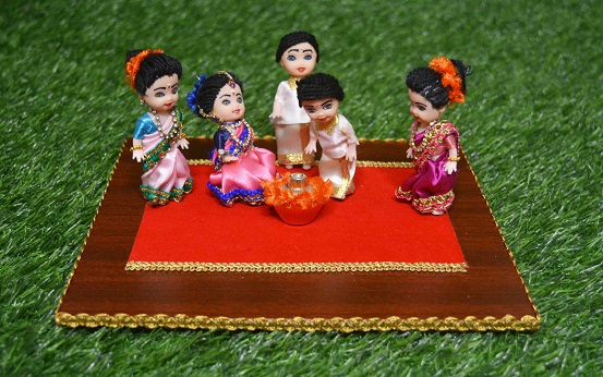 Motherhood is celebrated as Bangle function / Seemandham. Our Bangle trays and setups will capture your Valaikappu moments perfectly creating wonderful memories. We enhance the arrangement with heart-touching paper mache dolls. It is available in wide range of varieties and colors. You can choose our Baby shower trays and bangle holders either for rental or as ready to buy service.
